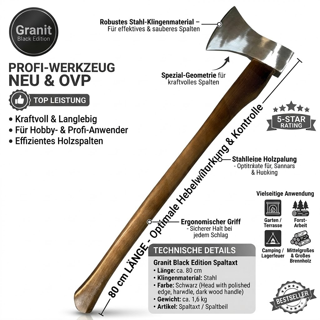 Granit Black Edition 80 cm Spaltaxt / Spaltbeil – Kraftvoll & Langlebig