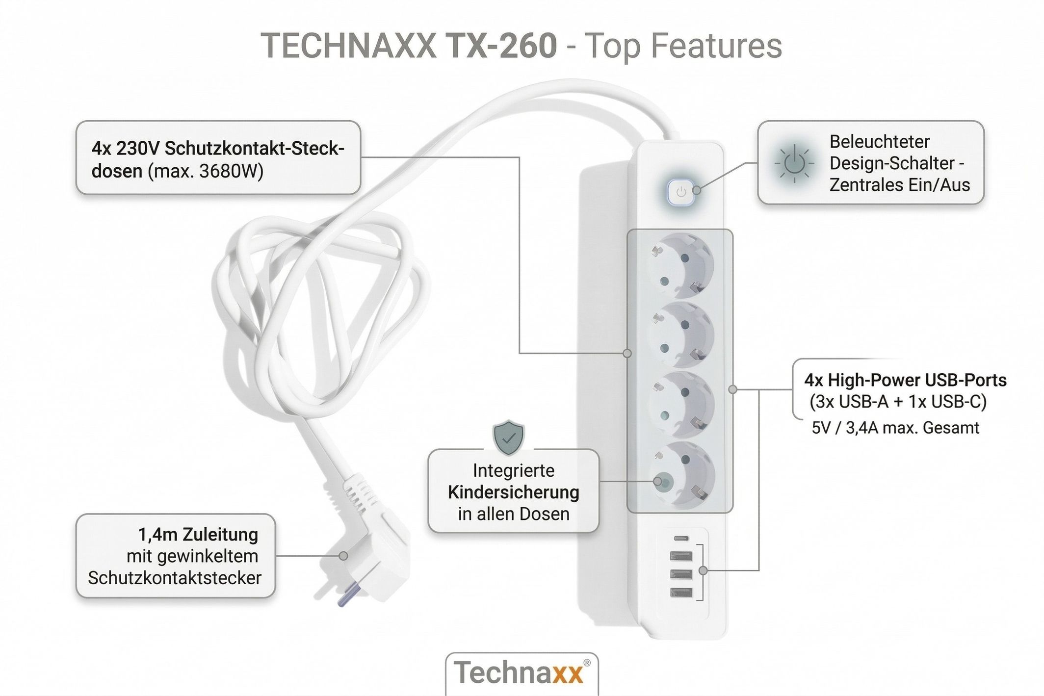 Technaxx 4-fach Steckdosenleiste 4x USB-Ports (1x USB-C) Schalter Kinderschutz