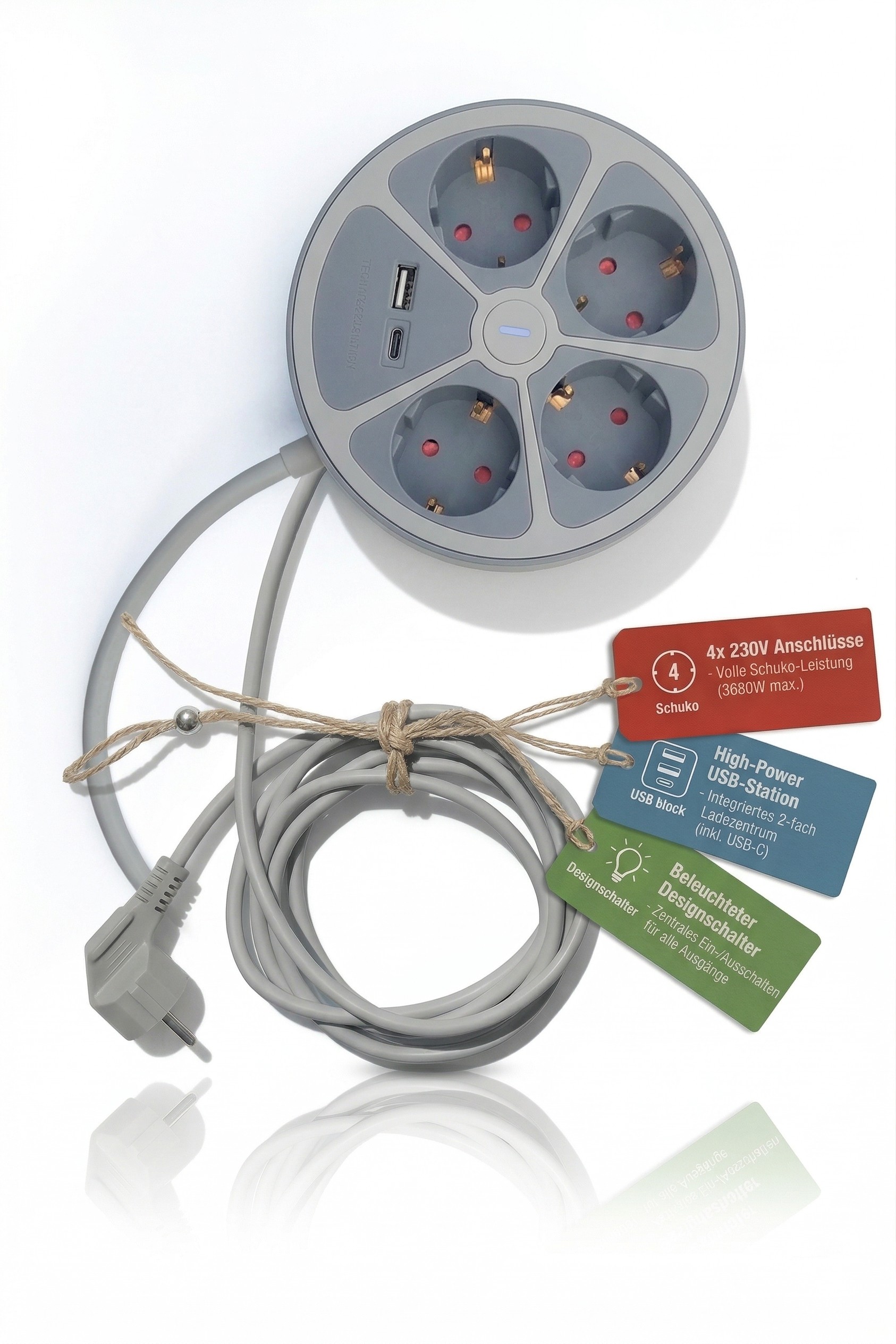 Technaxx Steckdosenleiste Rund 4-fach USB-C & USB-A Grau TX-262 | 3680W Design-Leiste
