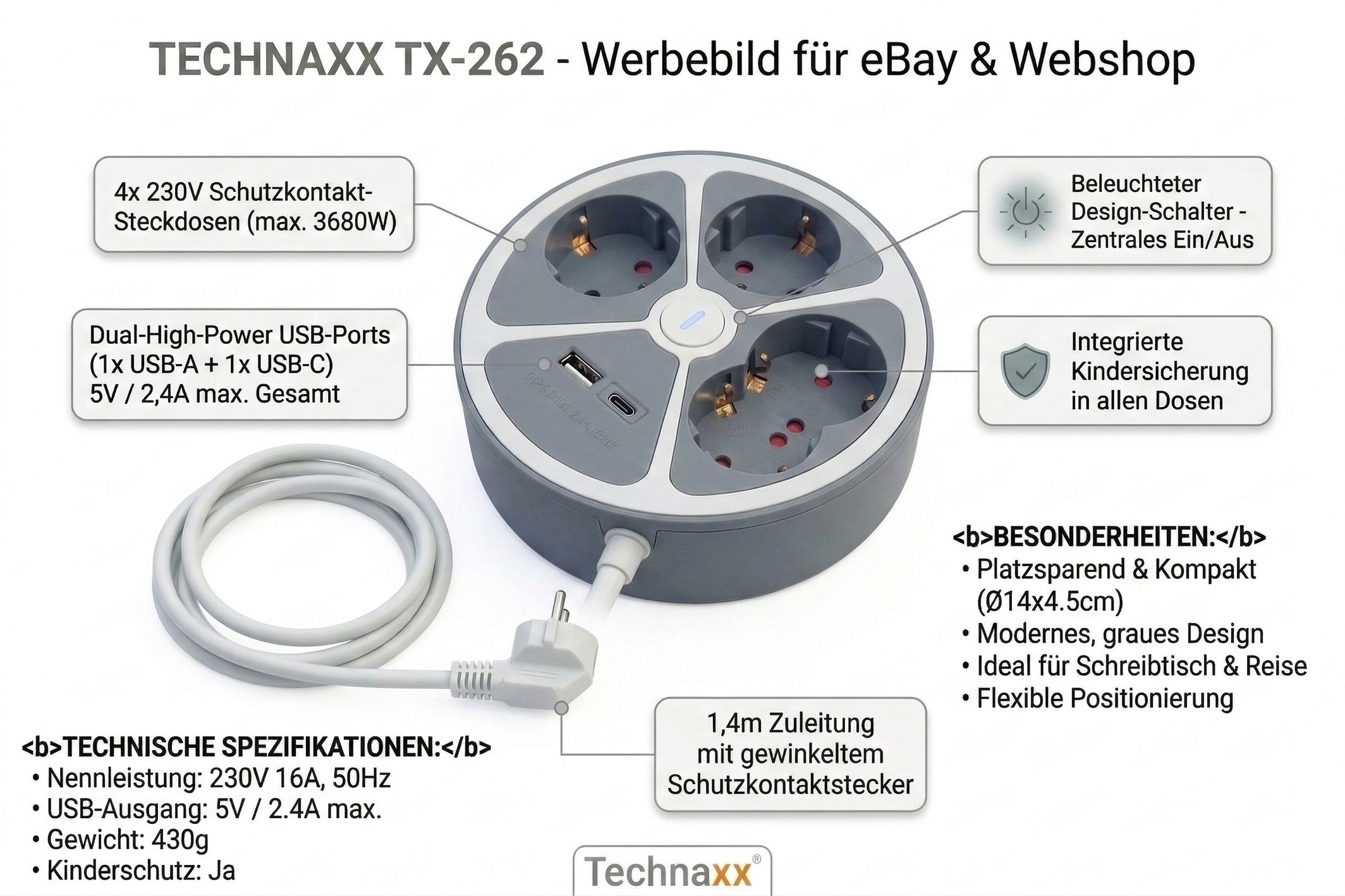 Die Technaxx TX-262 ist die ideale Lösung für alle, die eine kompakte und optisch ansprechende Stromversorgung suchen. Durch ihre runde Bauform und das moderne graue Design fügt sie sich dezent in jede Wohn- oder Büroumgebung ein. Sie bietet nicht nur Platz für klassische Elektrogeräte, sondern dient auch als zentrale Ladestation für Ihre mobilen Endgeräte.