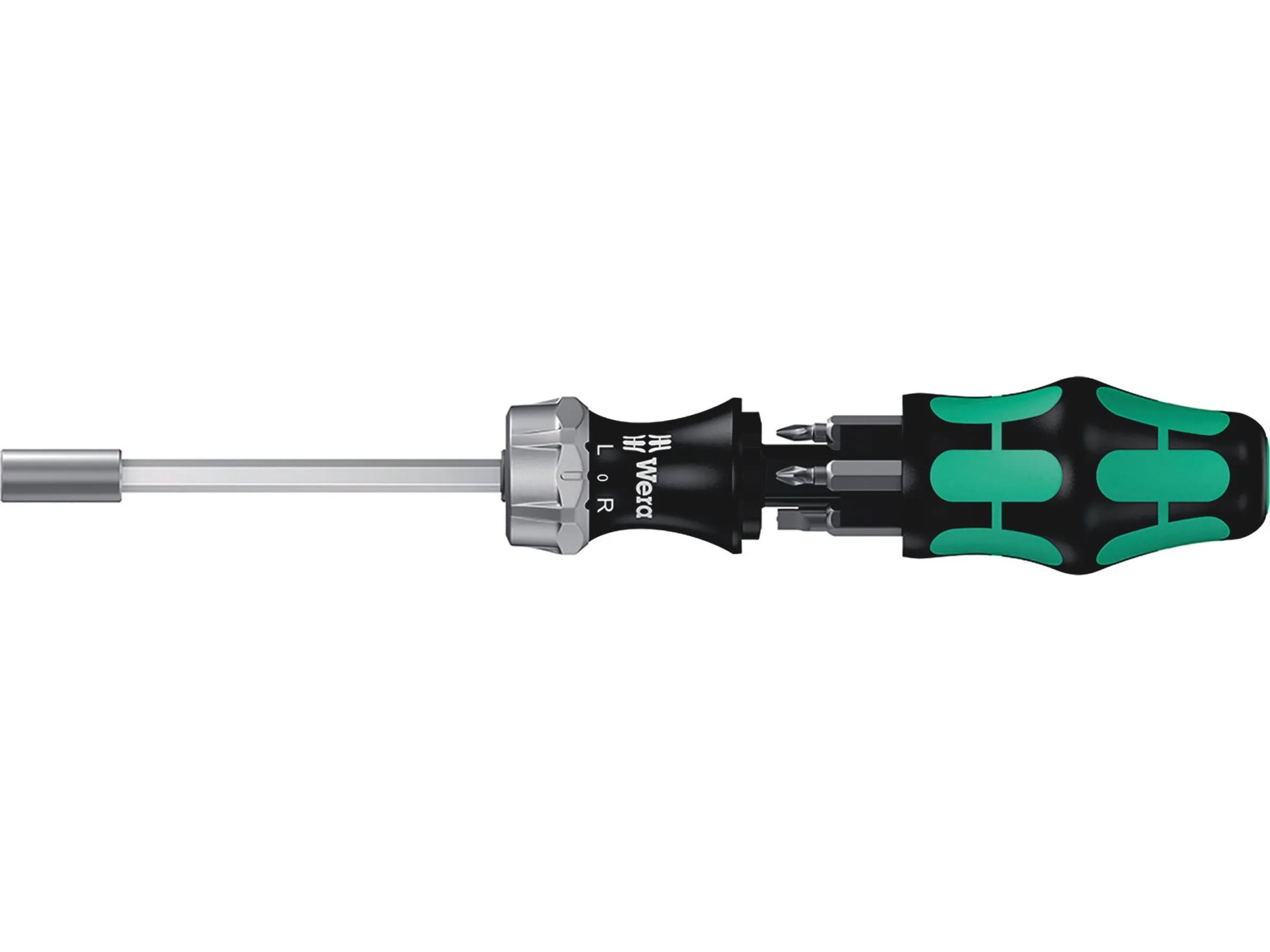 Kompaktwerkzeug mit mehrkomponentigem Kraftform Griff für hohe Arbeitsgeschwindigkeiten und besonders ergonomisches Verschrauben. Integriertes Bit-Magazin im Griff. Inkl. Ratsche: Feinverzahnung für geringen Rückholwinkel, Umschaltring (rechts, fest, links), maximales Drehmoment von bis zu 50 Newtonmetern; Sechskant-Klinge mit 1/4"-Innensechskantaufnahme, Edelstahlhülse, starker Dauermagnet.