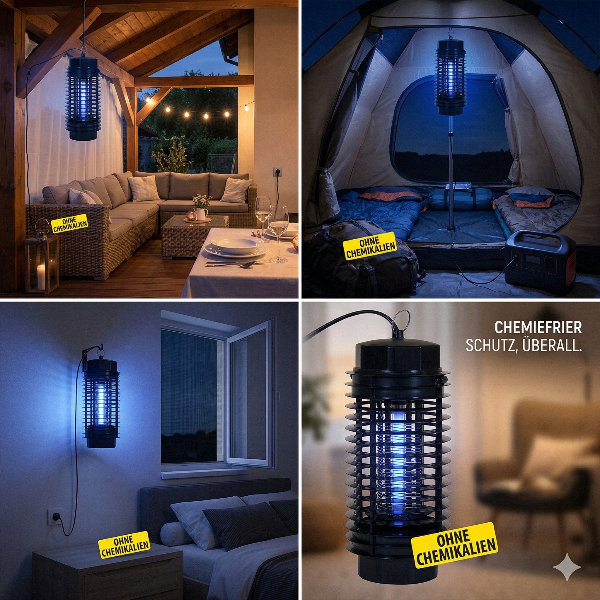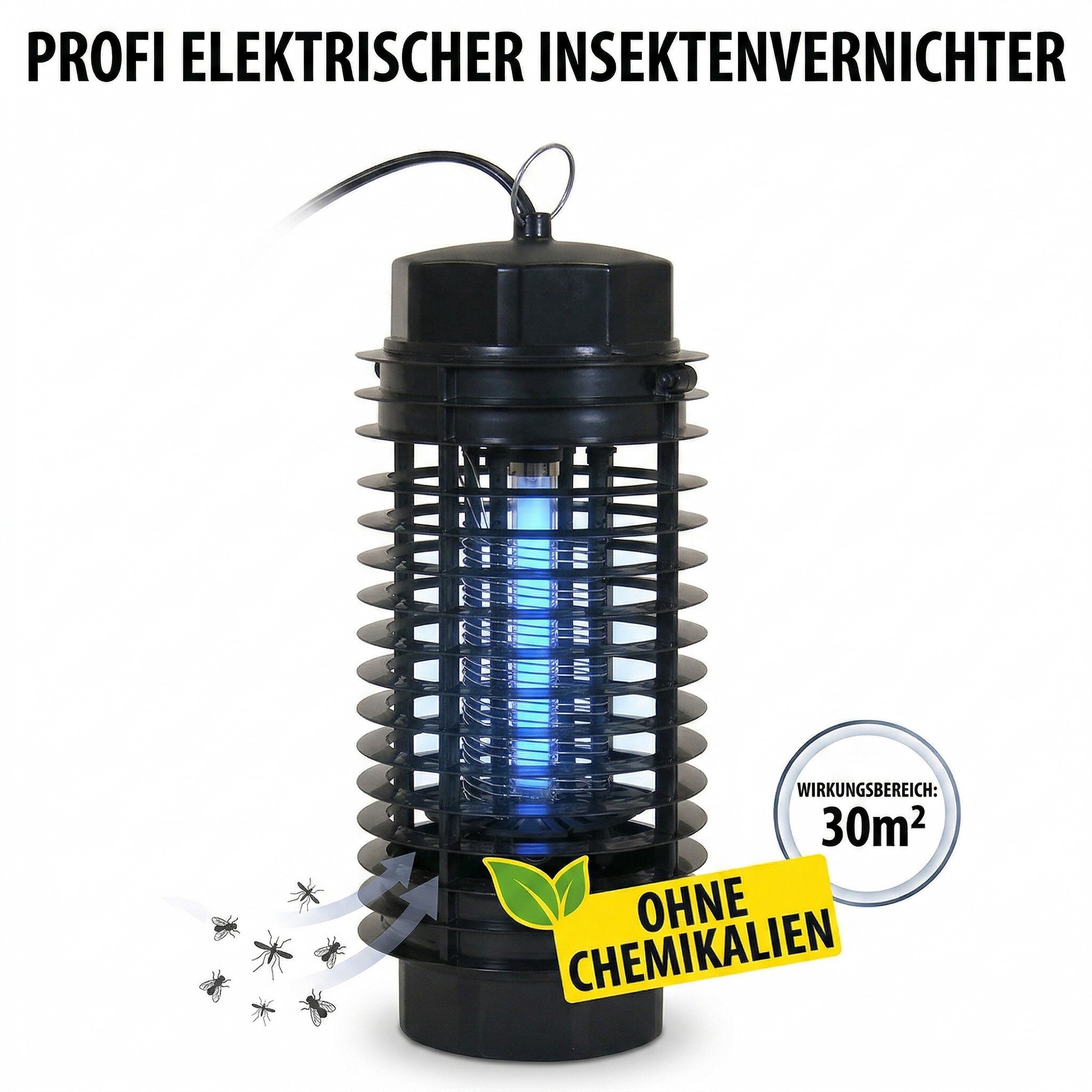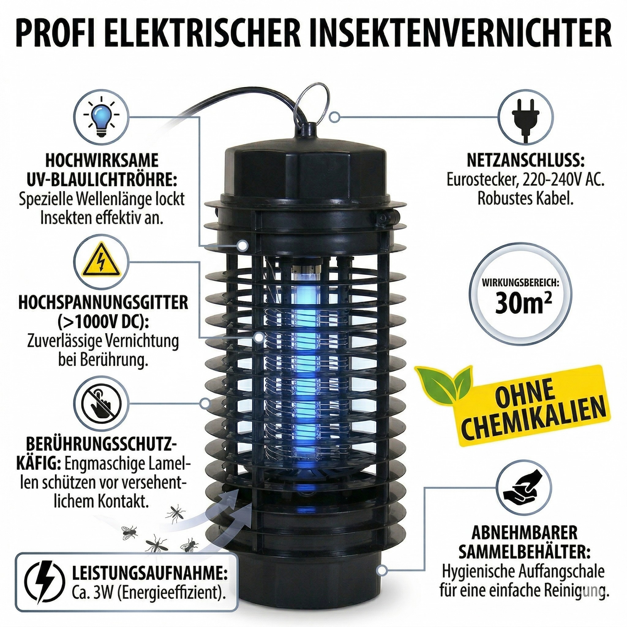 Sicher und umweltfreundlich ohne Chemikalien Dieses Gerät arbeitet vollkommen ohne den Einsatz von Giften oder chemischen Substanzen. Es entstehen keine Dämpfe und keine unangenehmen Gerüche. Dadurch eignet sich der Insektenkiller hervorragend für Haushalte mit Kindern oder Haustieren da keine gesundheitliche Gefährdung besteht. Es ist die ideale umweltfreundliche Alternative zu herkömmlichen Sprays oder Verdampfern.