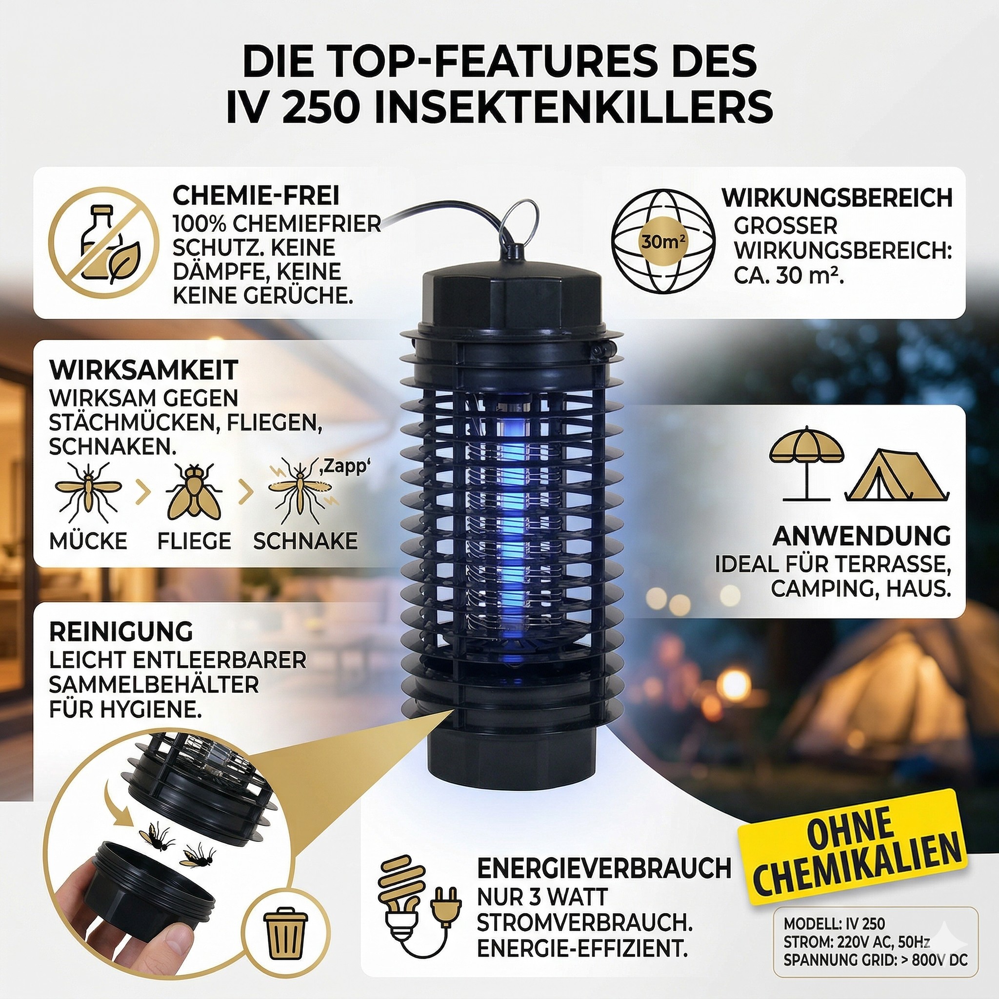 Technische Daten und Details Modellbezeichnung IV 250 Wirkungsbereich etwa 30 Quadratmeter Gitterspannung über 800 Volt Gleichstrom Stromversorgung 220 Volt Wechselstrom 50 Hertz Stromaufnahme maximal 3 Watt Leuchtmittel inklusive Blaulampe Fassung E14 Abmessungen 28 cm Höhe und 11.5 cm Breite Kabellänge 1.5 Meter Gehäusefarbe Schwarz