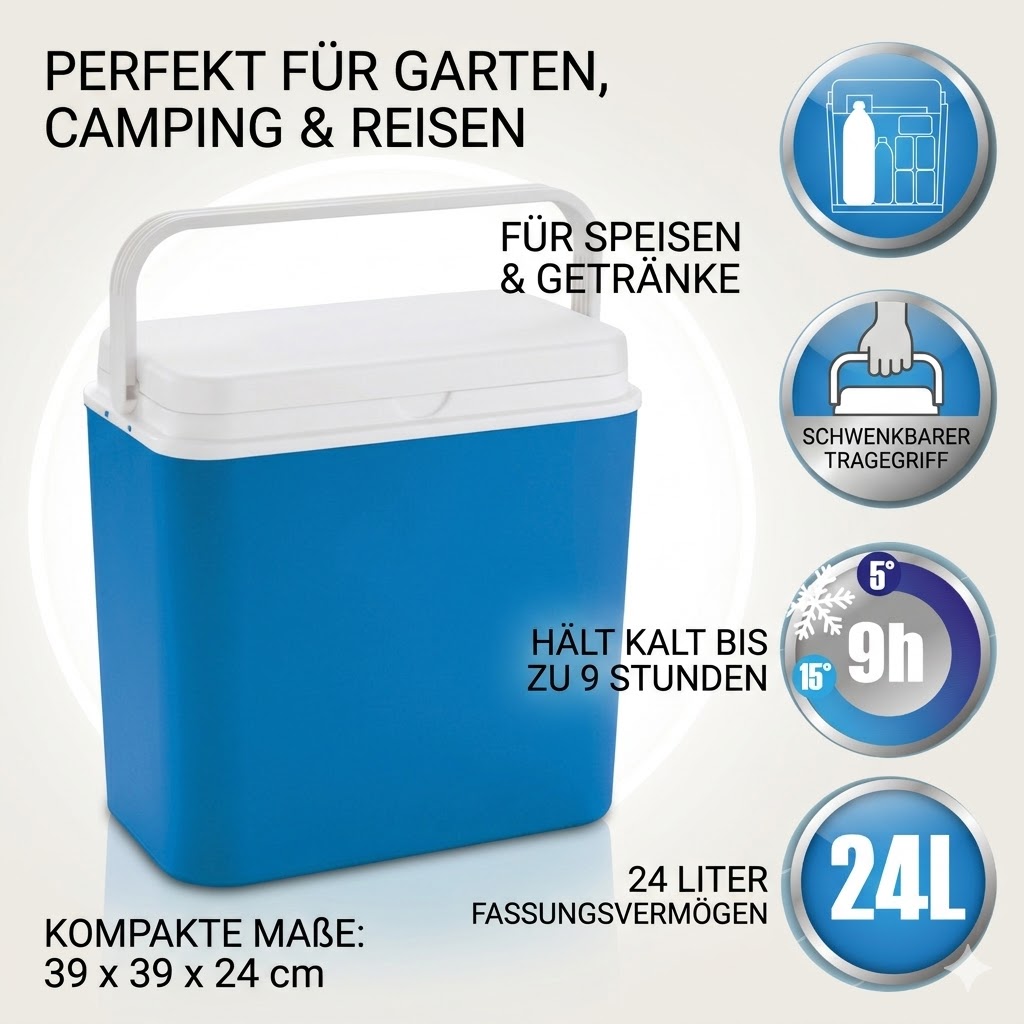 Diese tragbare Kühlbox mit einem großzügigen Fassungsvermögen von 24 Litern ist der ideale Begleiter für jede Gelegenheit. Ob im Garten, beim Camping, auf Reisen oder im Büro – deine Speisen und Getränke bleiben zuverlässig kühl und frisch.