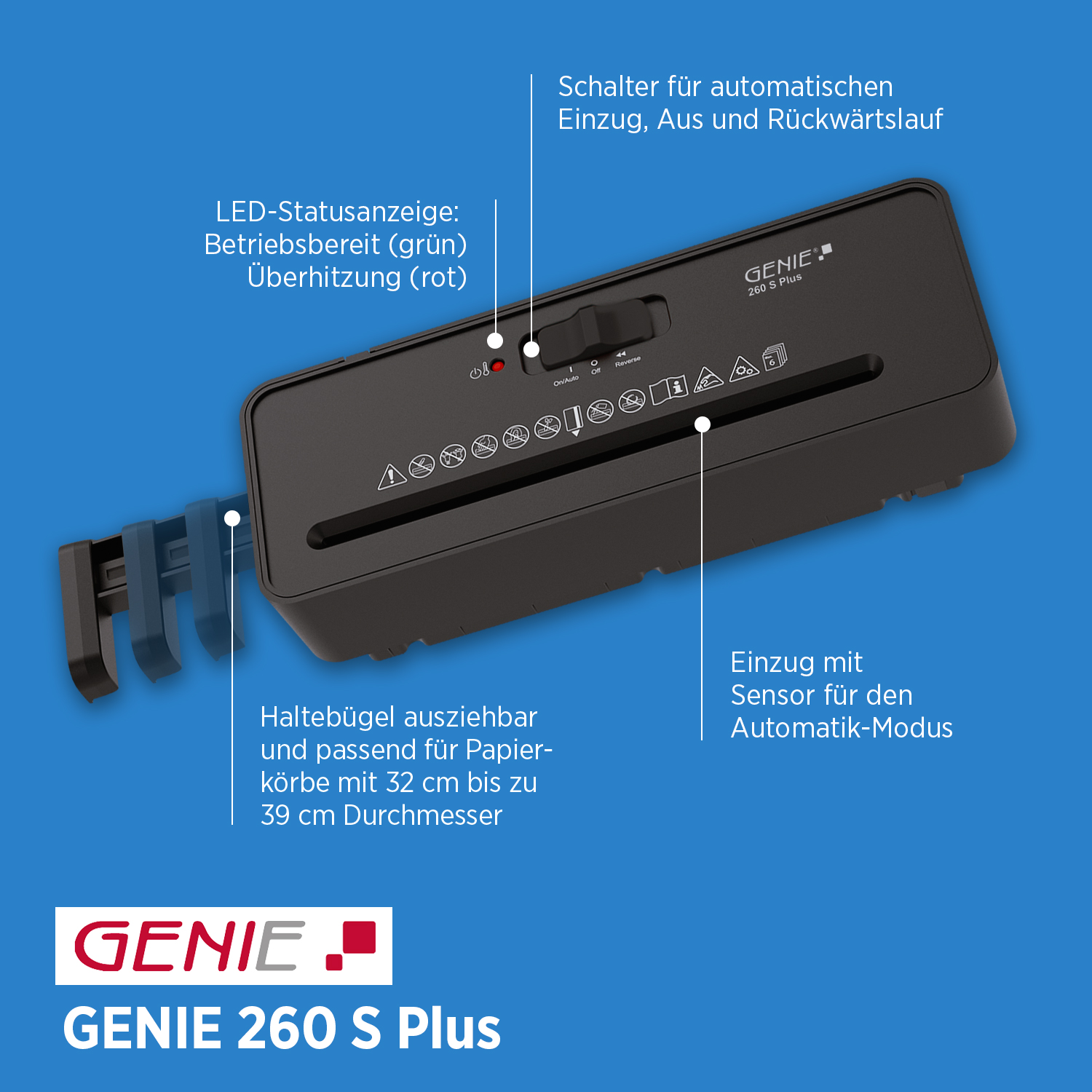 Die Bedienung ist einfach und sicher: automatische Start-Stopp-Funktion, Überhitzungsschutz und eine manuelle Rücklauffunktion bei Papierstau sorgen für einen reibungslosen Ablauf. Dazu arbeitet der GENIE 260 S Plus mit einer praktischen LED-Anzeige für Betriebsbereitschaft und Überhitzung.