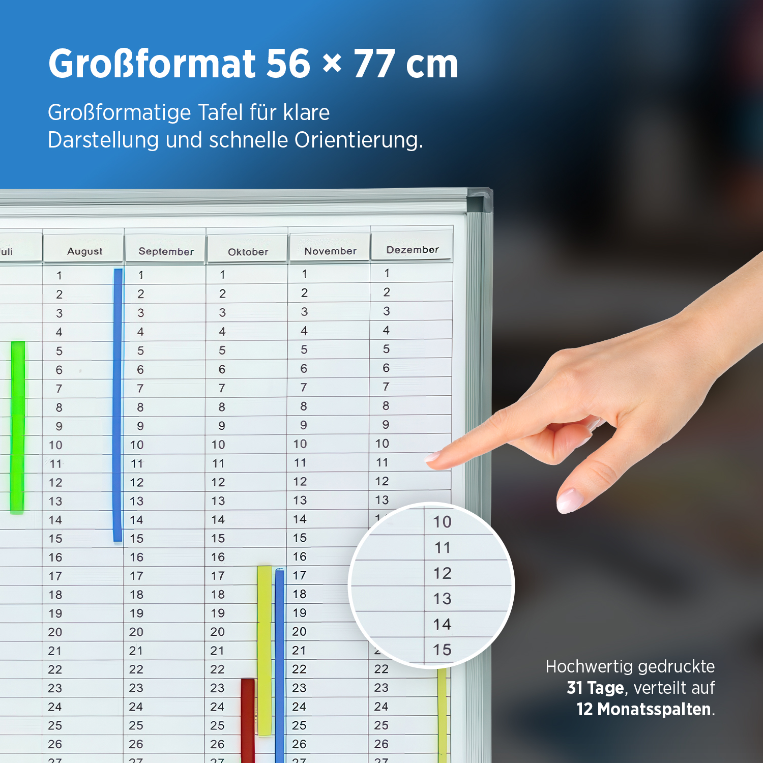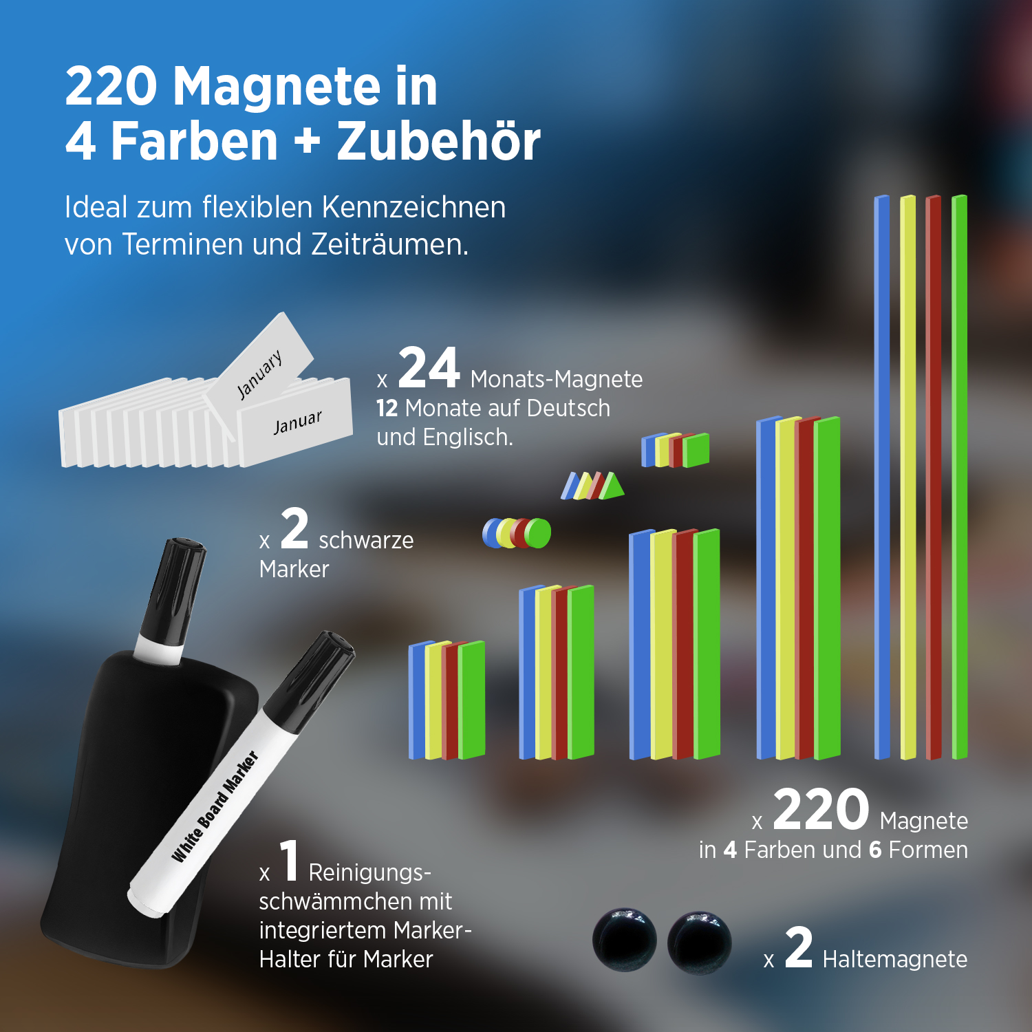 - Magnete in 4 verschiedenen Farben zum Markieren von Terminen und Zeitspannen (insgesamt 220 Magnete)