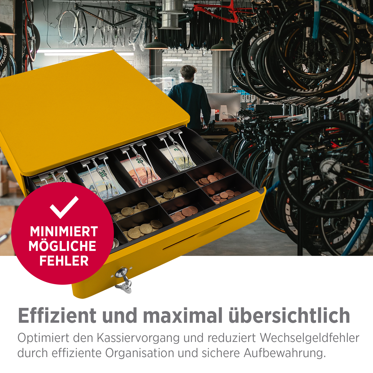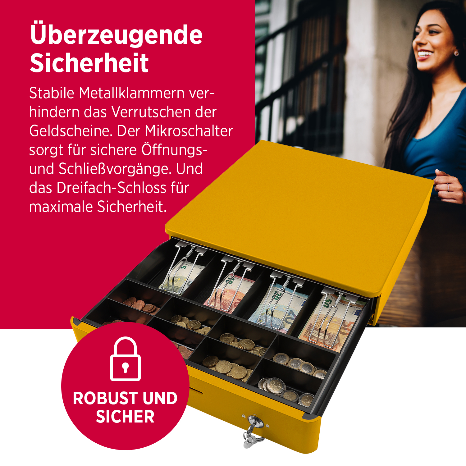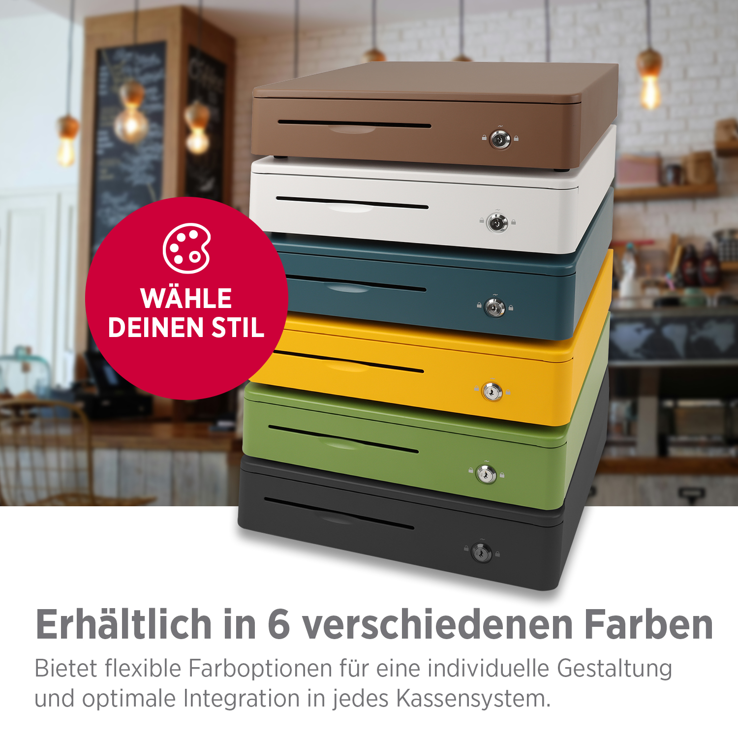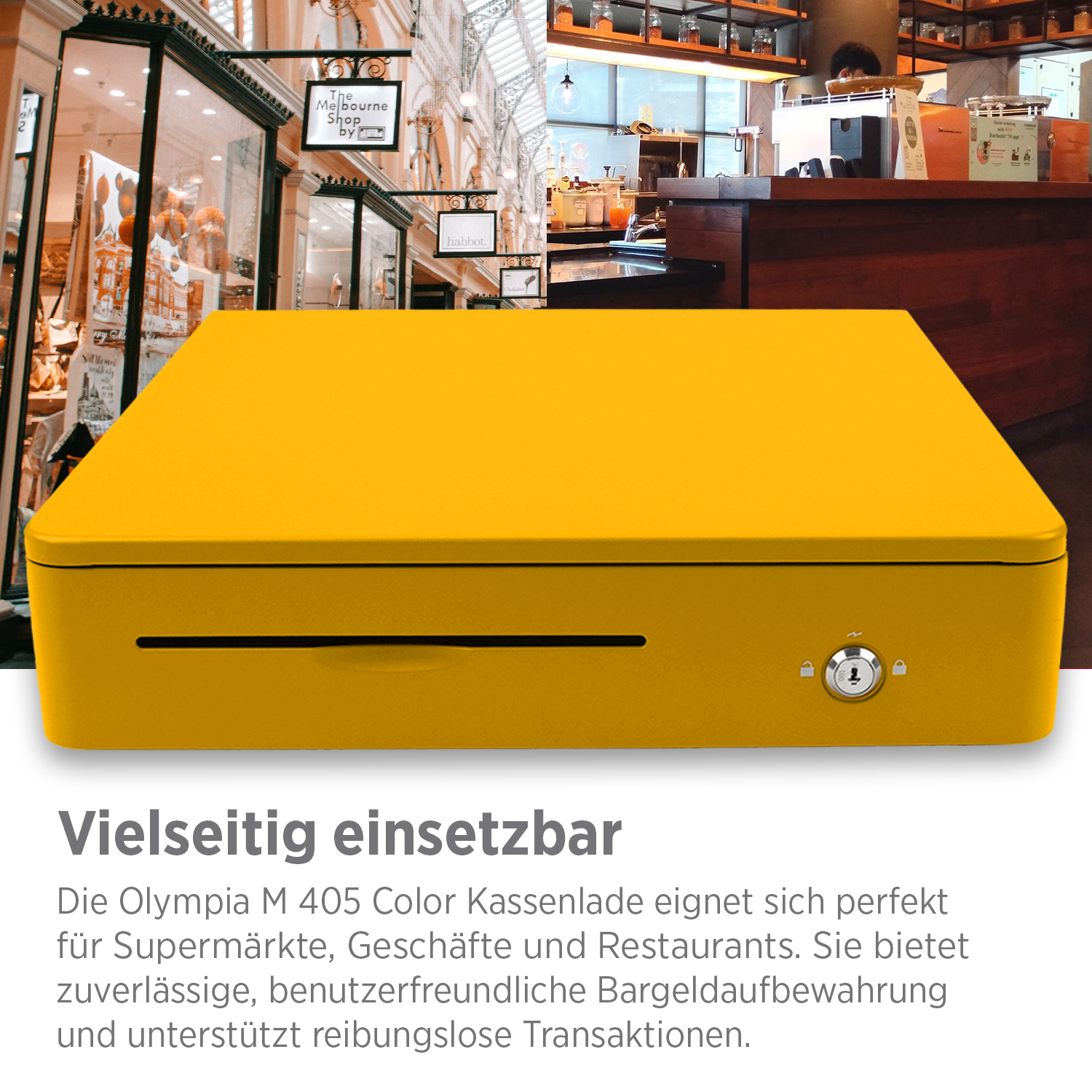 Die Olympia M405 Color Kassenlade überzeugt durch ihr robustes Vollmetallgehäuse, eine durchdachte Innenaufteilung und zuverlässige Funktion. Ideal für den täglichen Einsatz im Einzelhandel, in der Gastronomie oder im Büro.