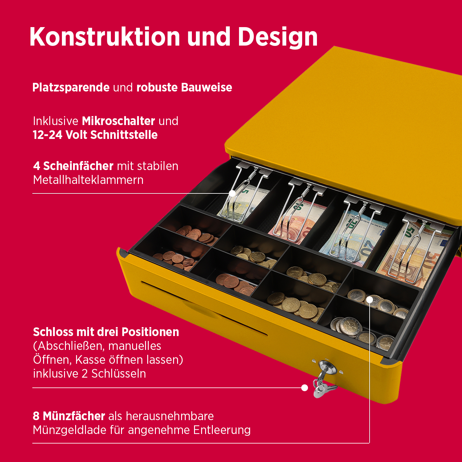 Fächer: 8 Münzfächer, 4 Scheinfächer