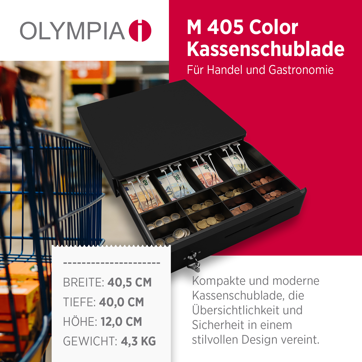 Die Olympia M405 Color Kassenlade überzeugt durch ihr robustes Vollmetallgehäuse, eine durchdachte Innenaufteilung und zuverlässige Funktion. Ideal für den täglichen Einsatz im Einzelhandel, in der Gastronomie oder im Büro.