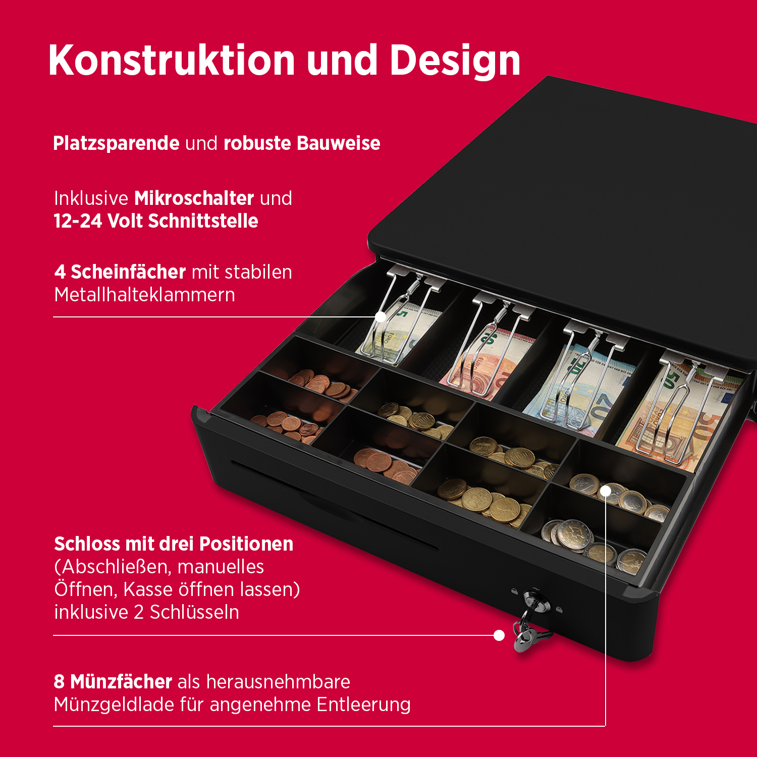 Fächer: 8 Münzfächer, 4 Scheinfächer