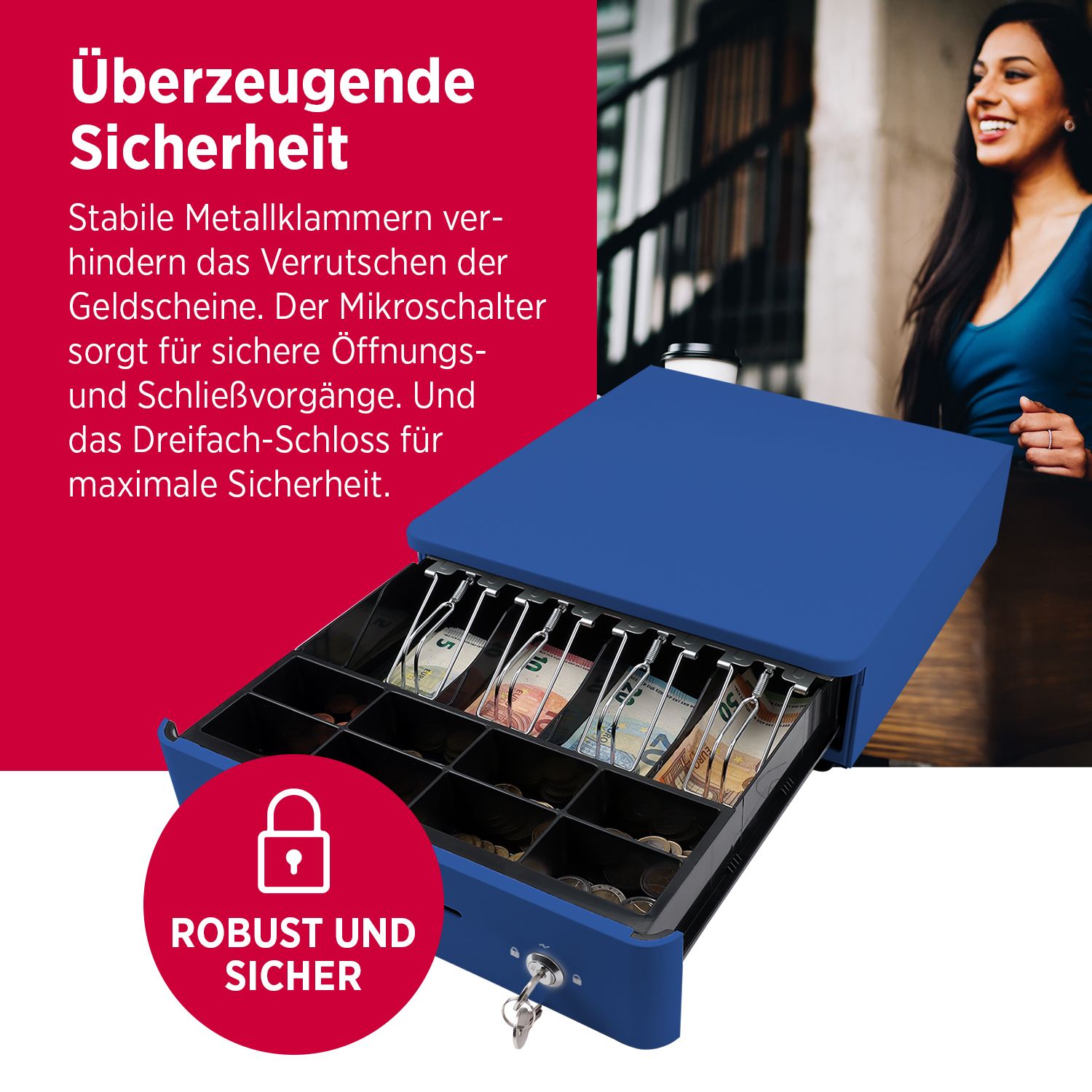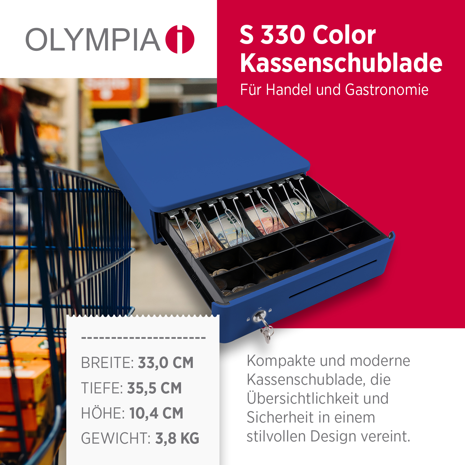 Die S330 Color Kassenlade ist die ideale Ergänzung für Ihr Kassensystem – ob im Einzelhandel, in der Gastronomie oder im Büro. Sie überzeugt durch ihre stabile Vollmetallkonstruktion, praktische Aufteilung und einfache Ansteuerung.
