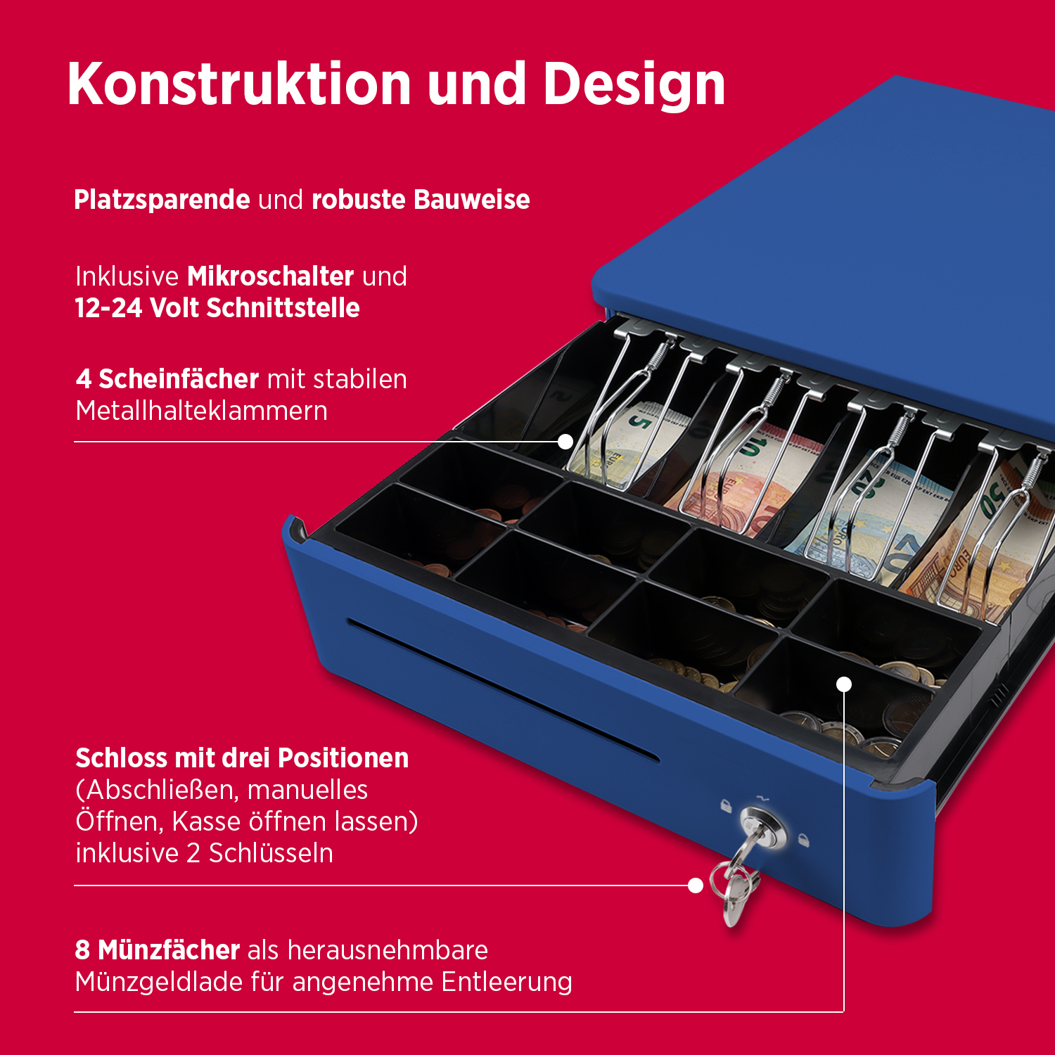 Fächer: 8 Münzfächer, 4 Scheinfächer