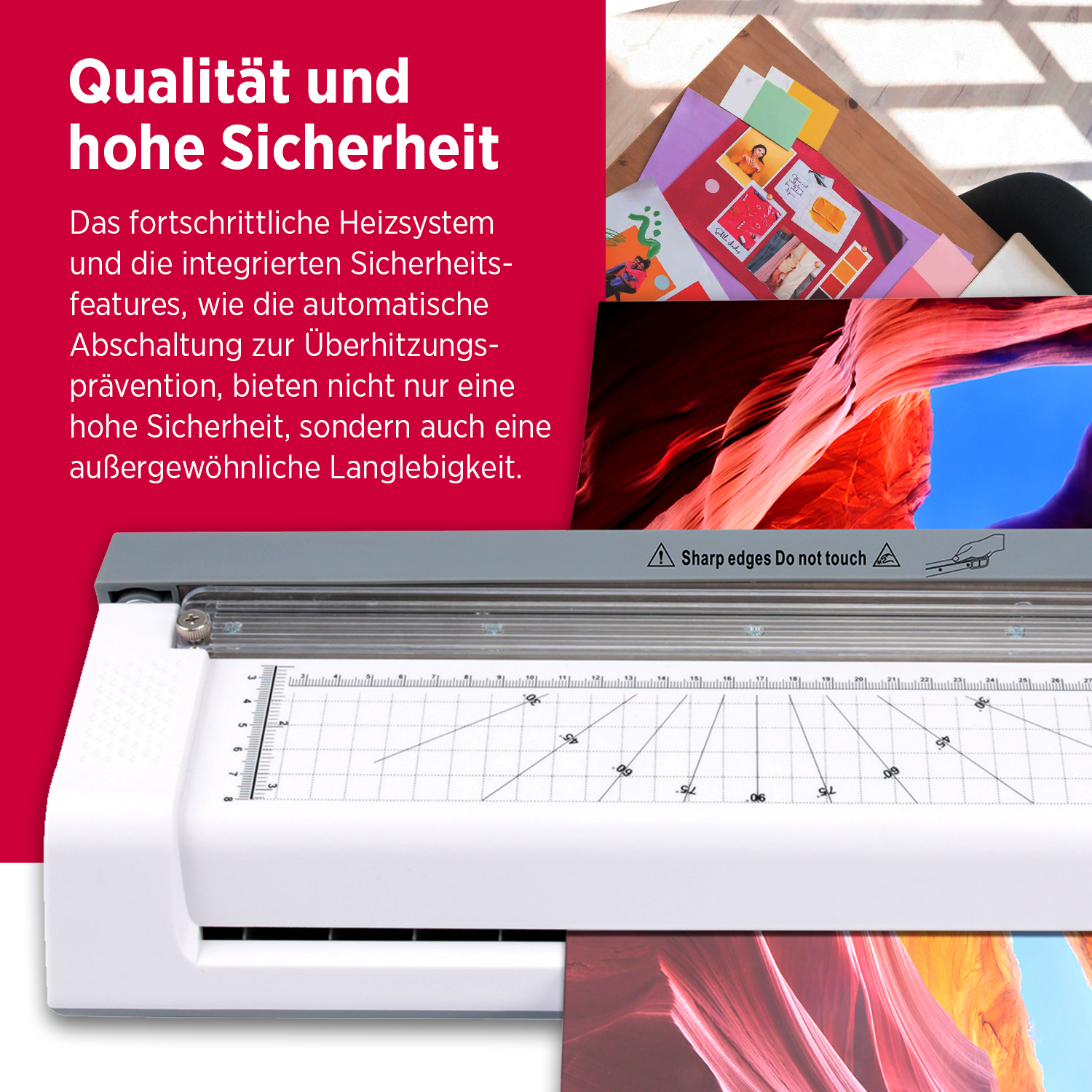 - Das hochwertige Heizsystem sorgt dafür, dass der Laminierprozess gleichmäßig erfolgt und Blasenbildung vermieden wird.