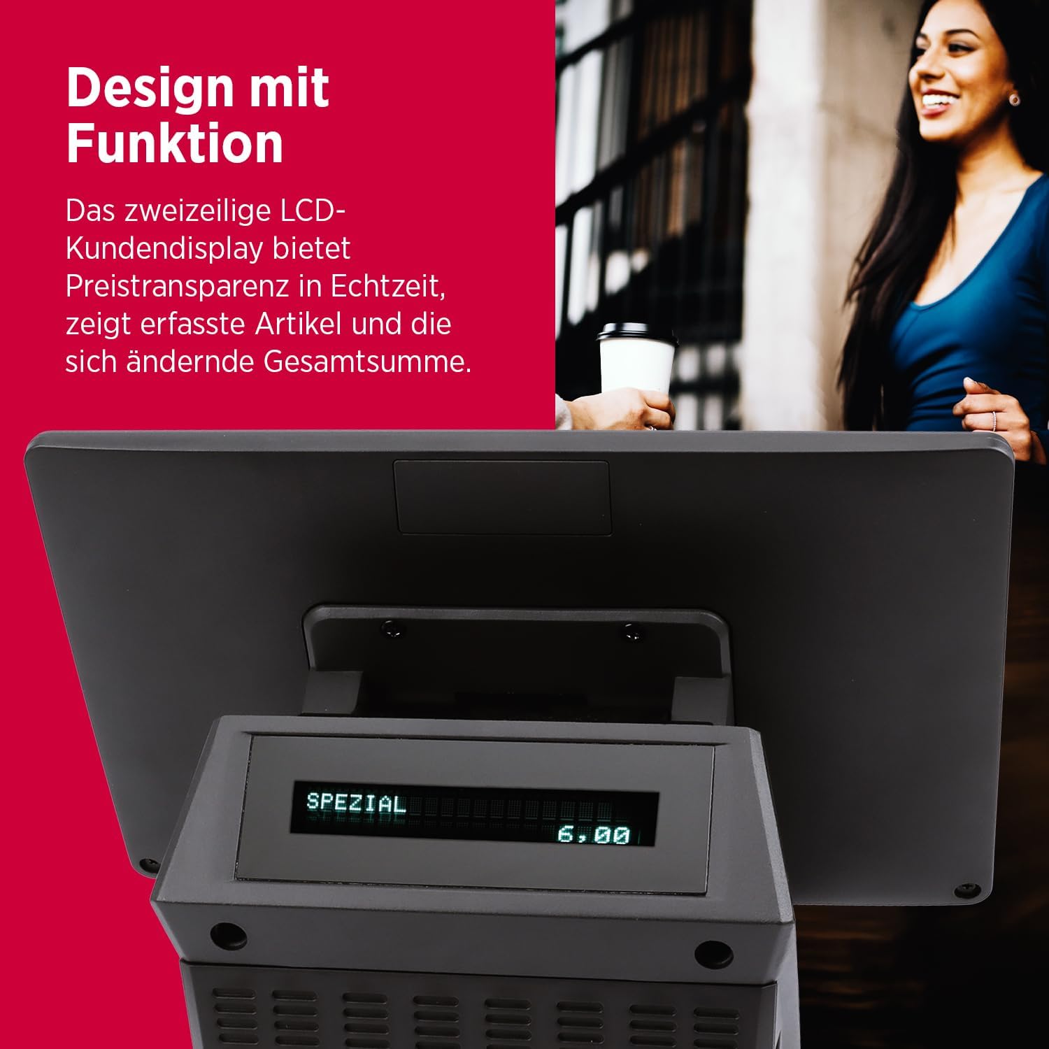 Schneller und leiser Bondruck für ein reibungsloses Kassieren. Inklusive grafischem Bonlogo für ein individuelles Erscheinungsbild. - Flexible Kundenanzeige