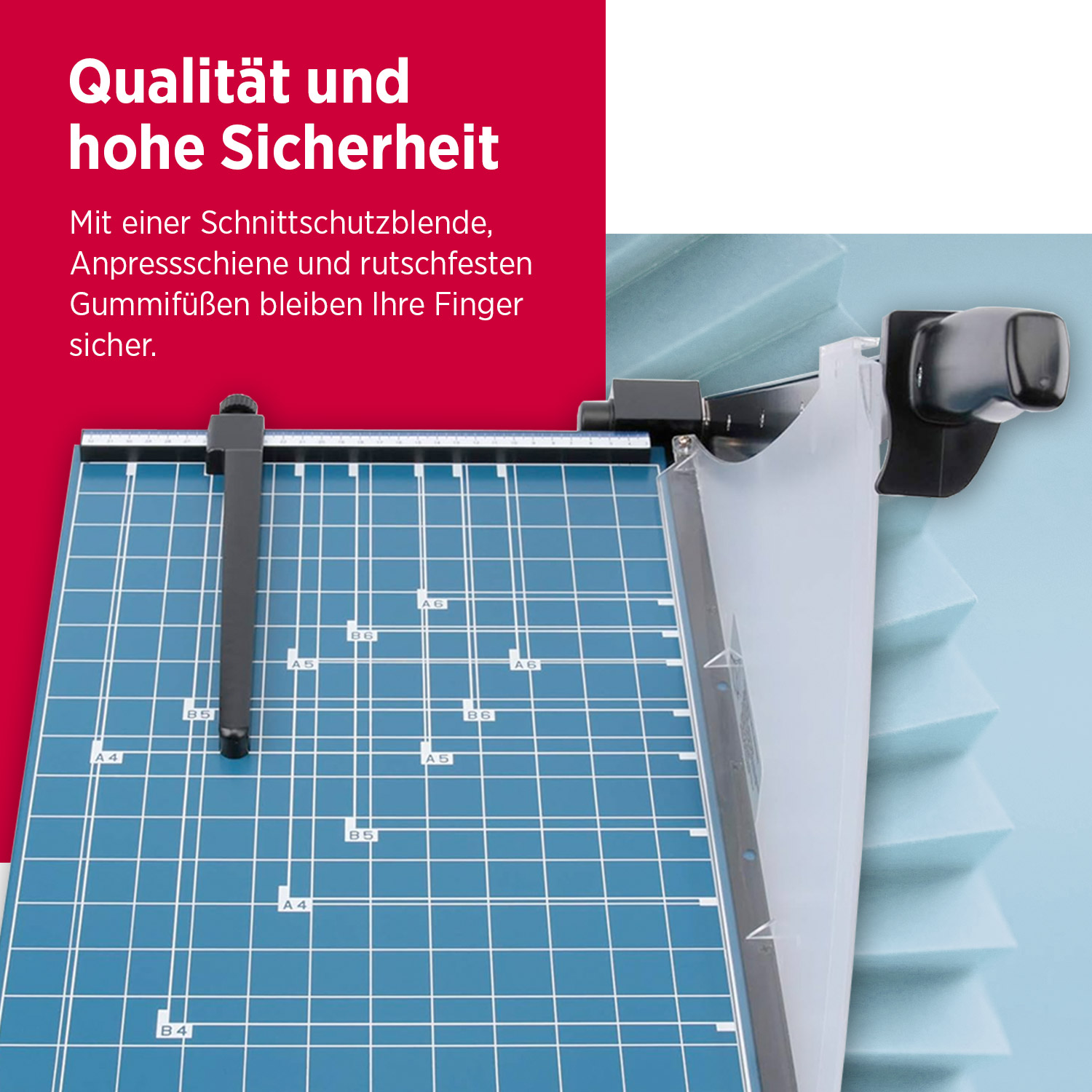 Das OLYMPIA G 4415 ist ein professionelles Hebelschneidegerät für DIN A3-Papiergröße mit einer maximalen Schnittleistung von 15 Blatt. Es eignet sich perfekt zum Zuschneiden von Fotos, Karten, Ausdrucken oder laminiertem Papier und ist ideal für Büros, Home-Offices und Schulen. Das Schneidegerät hat eine Arbeitsbreite von 448 mm und eine solide Papierauflage mit Metallplatte und Skalierungen, um ein präzises Schneiden zu gewährleisten. Gummifüße sorgen für eine sichere Benutzung und eine durchsichtige Anpressschiene mit Fingerschutz schützt die Finger des Benutzers. Der Hebel des Geräts kann arretiert werden, um es sicher zu transportieren oder zu lagern. Das Schneidegerät verfügt über dauerhaft scharfe Schneiden und hat eine Größe von 360 x 535 x 445 mm und ein Gewicht von 4,93 kg. Es ist in der Farbe Blau erhältlich.