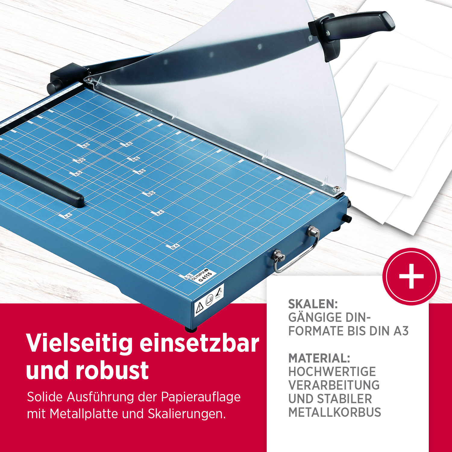 - Solide Ausführung der Papierauflage mit Metallplatte und Skalierungen