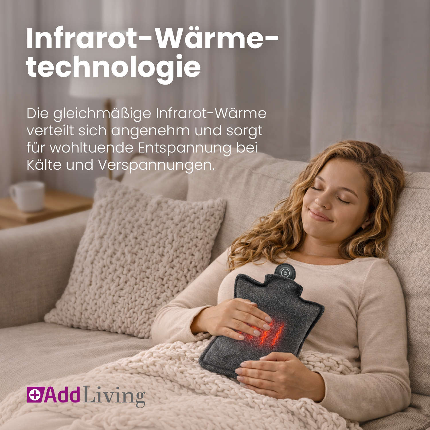 Die Addliving elektrische Wärmflasche verbindet klassische Wärme mit moderner Infrarot-Heiztechnologie und einem stilvollen Design in moderner Filzoptik. Ideal für entspannte Momente zu Hause, im Büro oder unterwegs.