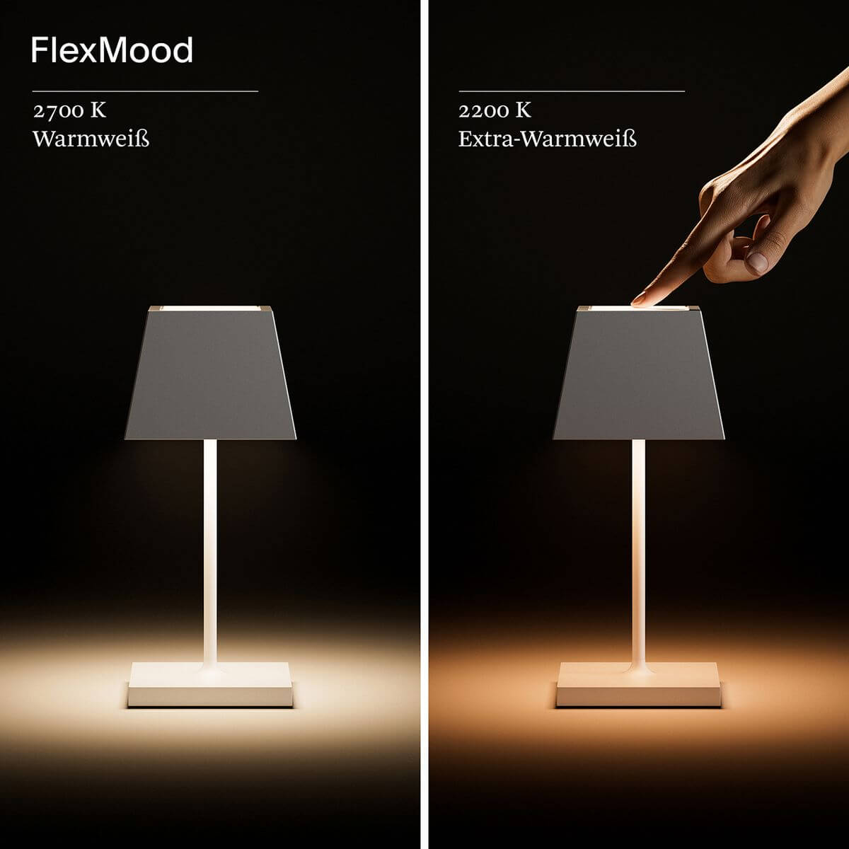 - FlexMood-Lichtstimmung: Wähle zwischen zwei warmweißen Farbtemperaturen (2.200 K und 2.700 K) für gemütliches Licht beim Lesen, Entspannen oder als Nachtlicht.